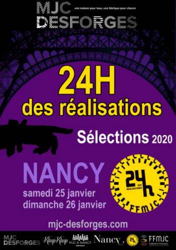 Les 24h des réalisations est un challenge cinématographique consistant à réaliser de A à Z un film en 24h sur un thème imposé. Un défi intense, fou et incroyable qui se joue désormais à l’échelle nationale pour la 6ème année consécutive entre plusieurs MJC avec la Fédération Française des MJC. La sélection nancéienne est organisée par le festival Klap Klap de la MJC DESFORGES.