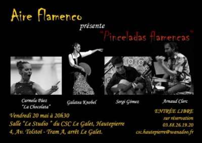 Dans le cadre du Festival Musiques du Monde organisé par le CSC Le Galet de Hautepierre, la Cie Aire Flamenco, présente sa dernière création "Pinceladas flamencas", des "touches" de flamenco dans un récital de musique latina ou viceversa.