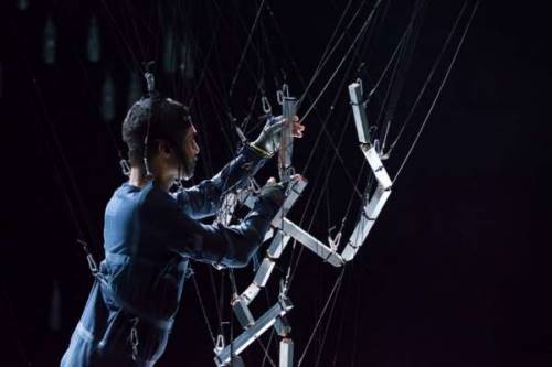 Avec son titre en farsi issu d’un proverbe populaire iranien, la création d’Ali Moini ajoute une pierre à sa démarche artistique oscillant entre rituels et mondes urbains. Tels deux insectes pris dans une toile d’araignée, le performer et sa marionnette métallique se livrent à un étrange dialogue de corps en suspens dans l’espace.