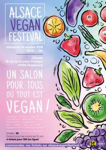 L’ALSACE VEGAN FESTIVAL est un événement tout public (vegans et non vegans) organisé par l’association Farplace France. A ce salon, vous pourrez découvrir des stands de nourriture, boissons, mode, décoration, hygiène, beauté, associations, etc. Il y aura aussi des conférences, des ateliers et des films. Les enfants sont les bienvenus et disposeront d’un endroit spécifique avec des activités. L’entrée standard est à 3€ et gratuite pour les moins de 15 ans. OFFRE SPÉCIALE : avant le 14 octobre, vous pouvez commander 4 tickets pour 10€. Faites plaisir autour de vous, et faites-vous plaisir aussi ! L’achat des tickets en amont du festival se fait ici : http://www.alsaceveganfestival.fr/the-show/octobre-2018-tickets/