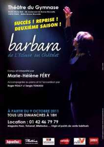 Ce spectacle raconte, en Récits, Chansons et Musique, le parcours de la chanteuse Barbara, et comprend deux périodes principales. La première concerne les dix années pendant lesquelles elle est interprète. Elle chante Brel, Brassens, Scotto..., en particulier au Cabaret de L’Ecluse, célèbre cabaret des quais de Seine, et la seconde se consacre à ses chansons. Un pot-pourri des mélodies des chansons les plus connues de Barbara, effectué par le musicien, relie ces deux parties de son itinéraire artistique.
