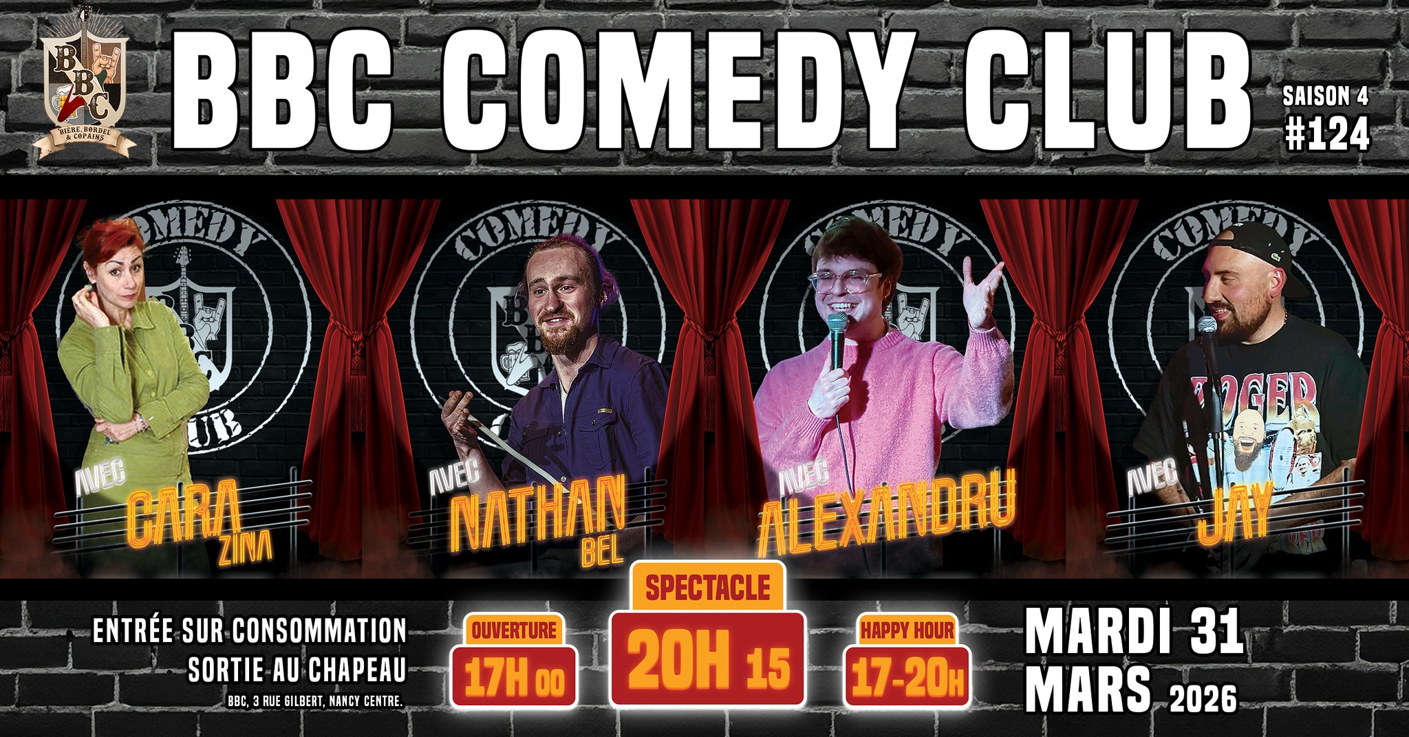 🎤🤣 Édition #124 du BBC Comedy Club (saison 4) – Mardi 31 mars 2026 à 20h15 !