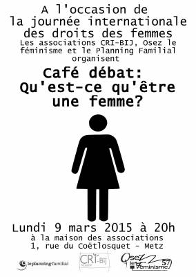 A l’occasion de la Journée internationale des droits des femmes, Le Planning Familial 57 organise un café-débat : "Qu’est-ce qu’être une femme?" en partenariat avec les associations CRI-BIJ et "Osez le féminisme!".