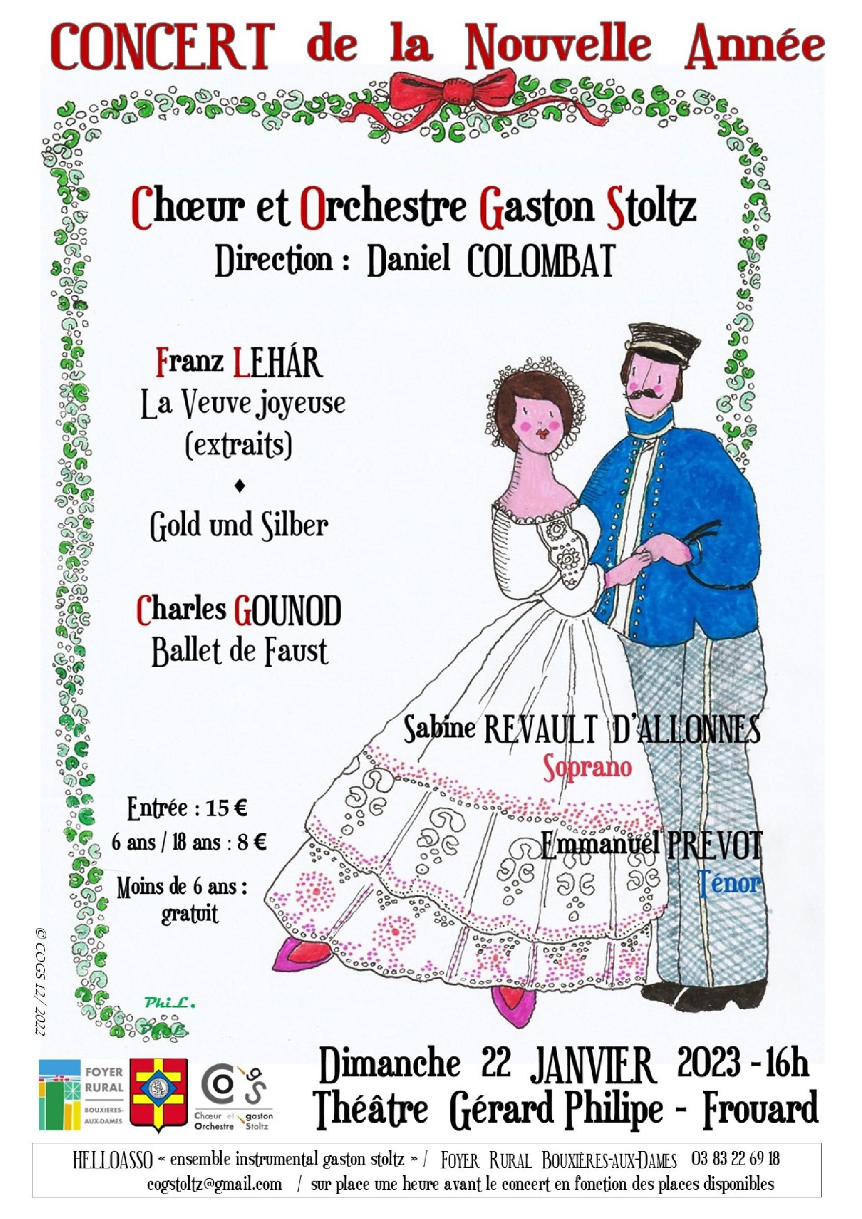 Interprétés par Sabine REVAULT D'ALLONES, soprano, Emmanuel PREVOT, ténor,et les 55 choristes et 40 musiciens du  Chœur et Orchestre Gaston Stoltz sous la direction de Daniel COLOMBAT,de grands extraits de "La Veuve Joyeuse "de Franz LEHÁR succèderont au "Ballet de Faust" de Charles GOUNOD pour ce Concert de la Nouvelle Année qui fera valser le cœur des spectateurs.