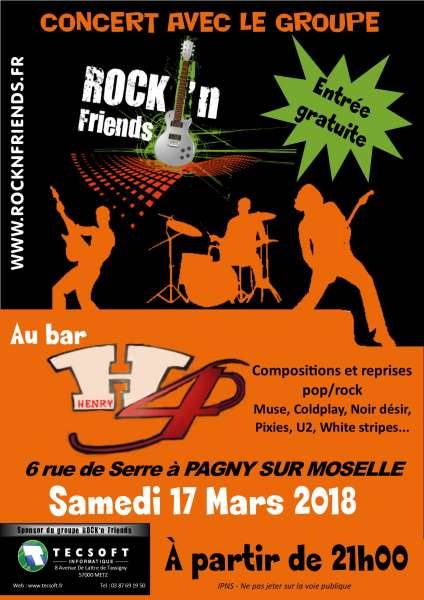 ROCK’n Friends vous donne rendez-vous le samedi 13 Mars 2018 à partir de 21h00 au bar "Henry IV" à Pagny sur Moselle.