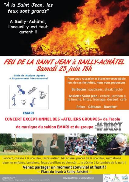Venez à l’éternel feu de la saint jean à Sailly-Achâtel mais avec cette année, DES CONCERTS !!!! Venez manger une saucisse, un steak, du jambon, une frite, chasser la sorcière et la brûler après un procès bien mérité ! Et de nouveau, cette année, on vous offre un feu d’artifice : elle est pas belle la vie ?