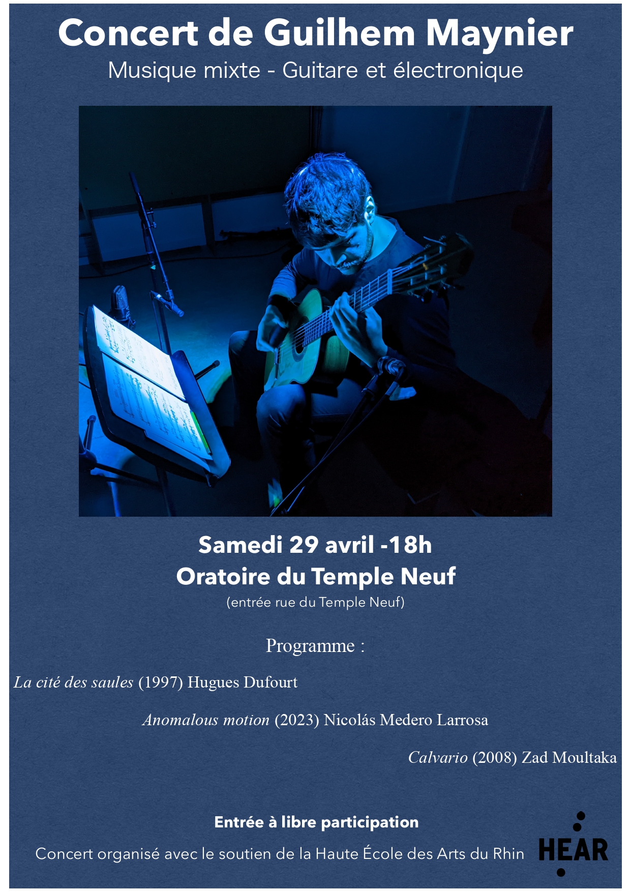 Le guitariste Guilhem Maynier donnera un récital à l'Oratoire du Temple Neuf (entrée rue du Temple Neuf) le samedi 29 avril à 18h.