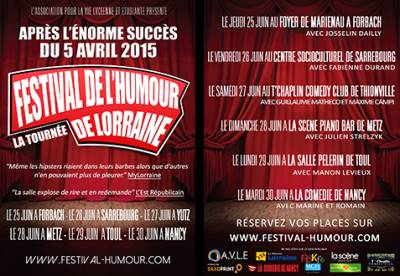 Après l’énorme succès de la première édition du Festival le 26 Avril 2014 et de la tournée à travers la région Lorraine qui suivit, l’Association pour la Vie Lycéenne et Etudiante a organisé le 5 Avril dernier la seconde édition du Festival de l’Humour de Lorraine à l’Espace Chaudeau de Ludres.