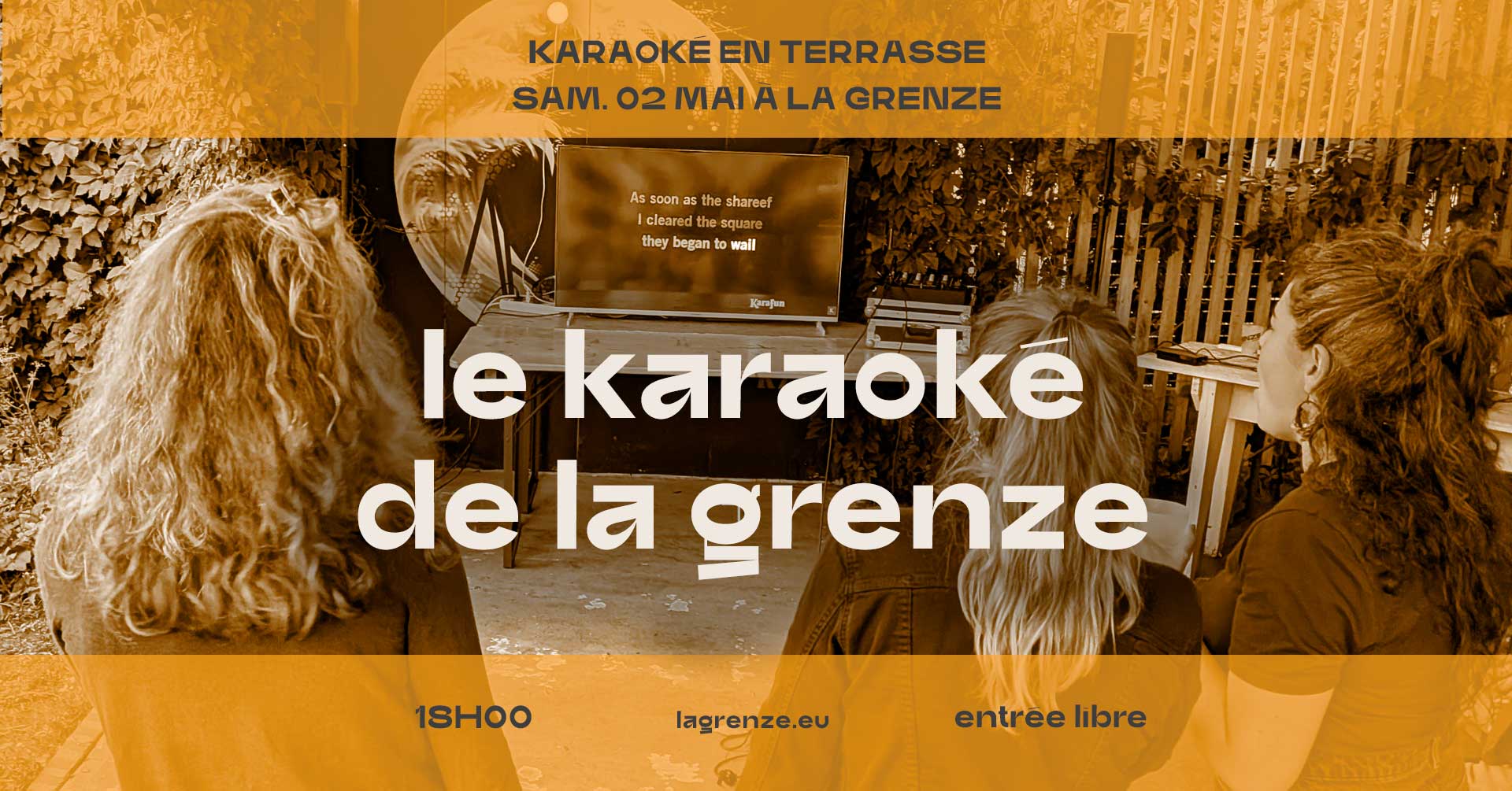 Pour fêter le week-end d'ouverture de la terrasse de La Grenze et la saison estivale, c'est karaoké en terrasse le samedi soir ! Alors viens donner ta plus belle voix dans les micros avec tes potos en solo ou en duo! Inscris-toi on sera là de 18h à 22h pour que tu puisses t'envoler dans les étoiles du fun du karaoké de La Grenze !