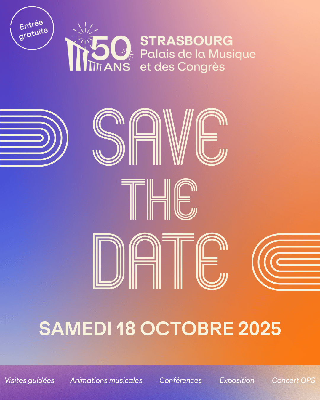 Cette année, le Palais de la Musique et des Congrès de Strasbourg célèbre un demi-siècle d'histoire au cœur de la vie culturelle, économique et institutionnelle de la capitale européenne. Pour marquer l'événement, vous êtes invités le samedi 18 octobre 2025 pour une journée exceptionnelle !