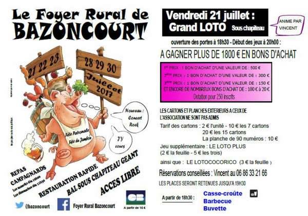 Loto organisé sous chapiteau par le Foyer Rural de Bazoncourt et animé par Vincent dans le cadre de la Fête Patronale et du Jambon.