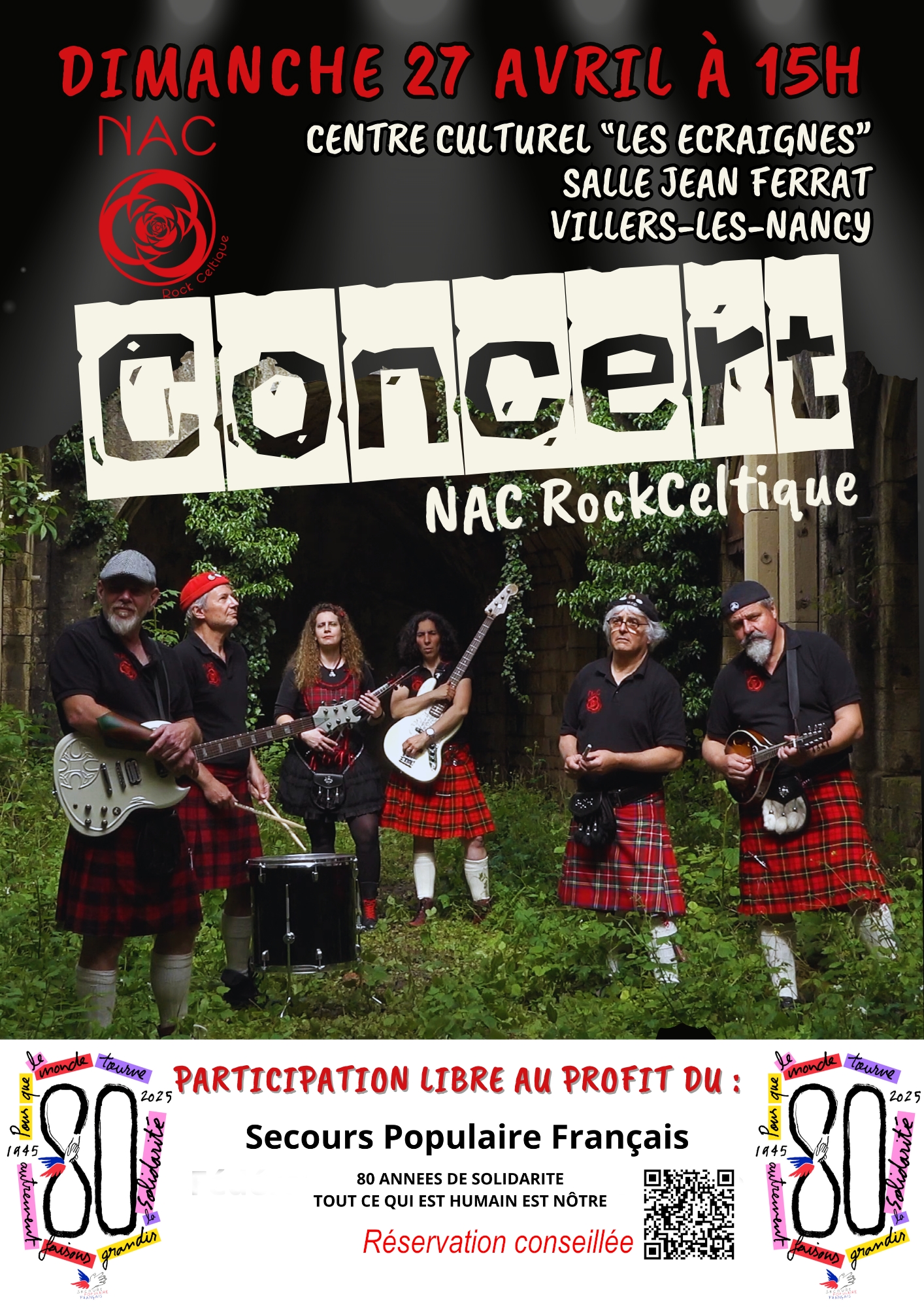Le Secours populaire fête ses 80 ans, et quoi de mieux que de se retrouver tous, en musique avec le groupe NAC, qui nous invite à ce moment de convivialité et de solidarité. Participation libre au bénéfice de toutes les actions menées par le Secours populaire.