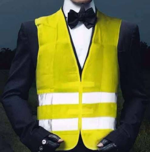 Costard 3 pièce avec un gilet jaune fluo de circulation.