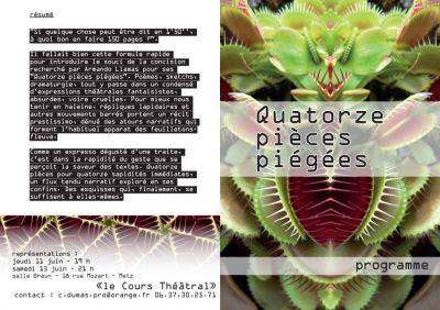 "Si quelque chose peut être dit en 1’50’’, à quoi bon en faire 150 pages ?". Il fallait bien cette formule rapide pour introduire le souci de la concision recherché par Armando Llamas pour ses "Quatorze pièces piégées". Poèmes, sketchs, dramaturgie, tout y passe dans un condensé d’expressions théâtrales fantaisistes, absurdes, voire cruelles. Pour mieux nous tenir en haleine, répliques lapidaires et autres mouvements barrés portent un récit prestissimo, dénué des atours narratifs qui forment l’habituel apparat des feuilletonsfleuve. Comme un expresso dégusté d’une traite, c’est dans la rapidité du geste que se perçoit la saveur des textes. Quatorze pièces pour quatorze sapidités immédiates, un flux tendu narratif exploré en ses confins. Des esquisses qui, finalement, se suffisent à elles-mêmes.