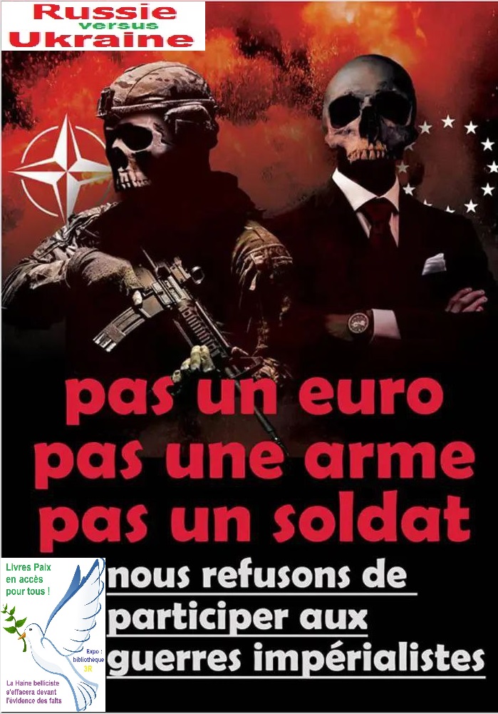 Samedi 30 septembre de 14h à 17h30, place Kléber à côté de la statue aura lieu un rassemblement (+ expo livres & documents) en faveur de la paix. Invitation à toutes personnes non bellicistes afin d'offrir à nos concitoyens l'occasion d'un temps d'expression contre la cobelligérance Française en Ukraine. Cobelligérance coûteuse pour notre économie et pour la vie des slaves qui s'entretuent dans un brasier qu'allumèrent Joe & Ursula avec l'aval d'Emmanuel. Trucider du slave ne sauvera pas notre régime de retraite, mais éjecter Macron si ! Osons promouvoir la paix, ayons le courage de ne pas attendre le feu vert des partis & syndicats & organisations, de la défunte "gauche". Lorsque les apparatchiks daigneront sortir de leur coupable apathie, soumission au récit de l'OTAN, il sera trop tard. Osez agir pour la paix maintenant ou résignez-vous à servir de combustible en cas d'embrassement total du conflit.