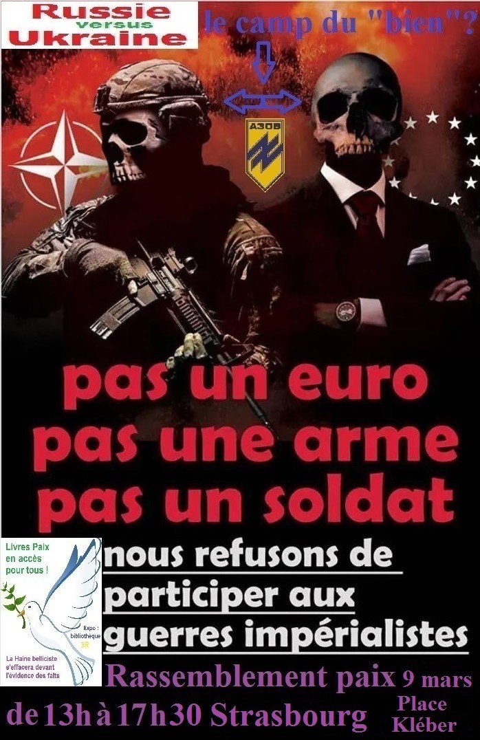 Rassemblement contre la guerre que n'exclut pas Macron. Il veut la guerre, qu'il la fasse lui-même. Qu'il parte en Ukraine, cela nous fera la paix. Il nous coûte un pognon de dingue et ridiculise notre pays. Jamais un Président ne déshonora autant la République tout en menaçant nos vies. Montrons notre refus d'obéir au Gauleiter de l'oligarchie. Venez au rassemblement pour la paix qui n'adviendra pas si l'on poursuit et amplifie la cobelligérance Française. Exigeons des députées qu'ils utilisent l'article 35 alinéa 3 afin d'enclencher le processus de cessation (ou non) du soutien militaire à l'Ukraine...qui fut décidé sans notre accord ! Soutenons la démarche du sénateur Houpert et du député Dupont-Aignan, initiateurs d'un référé au Conseil d'État pour un débat et un vote à l'assemblée sur l'accord (gravissime) de coopération défense Macron-Zelinski. Refusons que Macron brade la dissuasion nucléaire pour la mettre au service de l’U.E qui à terme sera étendue à l’Ukraine. Refusons de devenir des cibles dans un conflit qu’initièrent les U.S.A & l’U.E ! Zelenski sacrifiera les slaves aussi longtemps qu'il recevra des armes. Négociation avec la Russie pour qu'elle ne dévore davantage l'Ukraine qui hors OTAN et U.E sera une garantie de paix. Ne croyez pas les médias, l'ourse Russe n'enverra pas son armée à Paris, il a trop peur que ses soldats (découvrant la ""modernité"" de l'ouest) deviennent wokes ! Agir pour la paix, c'est maintenant, sinon demain l'on engraissera les actionnaires (de l'armement) en pourrissant dans le Tchernoziom ! Opposition à toutes les guerres initiées par les mondialistes en Ukraine et à Gaza ! Citoyens patriotes, harcelez (légalement) votre député, tout en venant à Strasbourg déplaire aux bellicistes européistes, puis lorsque nous serons plus nombreux conscients du péril, allons à Paris pour (enfin) faire fuir la punaise de lit trônant à l'Élysée. Soyons solidaires des paysans, pas de l'OTAN ! Déclaration évènement en préfecture, accès libre. Nous serons sous une tonnelle (expo livres) à côté de la statue Kléber.