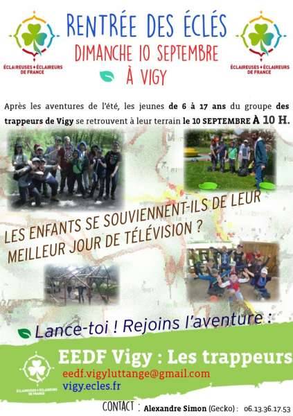 L’été et ses riches aventures se terminent, dimanche 10 septembre est l’occasion de ré-engager une dynamique d’année riche en projets, jeux et expériences chez les trappeurs de Vigy. N’hésitez pas à partager à tous cet évènement ou tous les intéressés et les curieux seront accueillis avec joie.