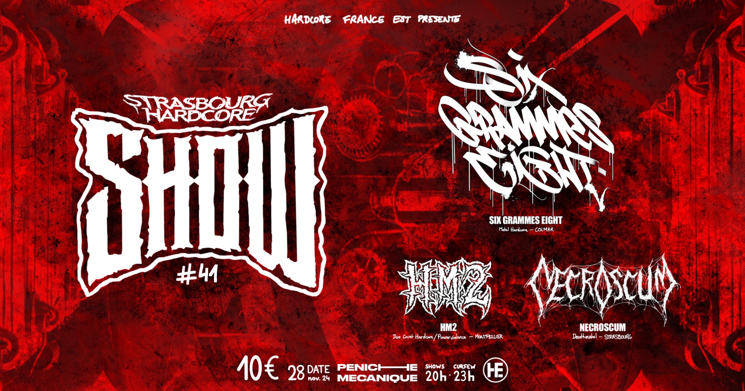 Hardcore France Est t'invite à assister à un line up frenchie dur comme des clous comme dirait les ricains, le jeudi 28 novembre à la Péniche Mécanique. On accueille les anciens de Six Grammes Eight avec grand plaisir pour un retour en grande pompe après 5 ans d'absence !