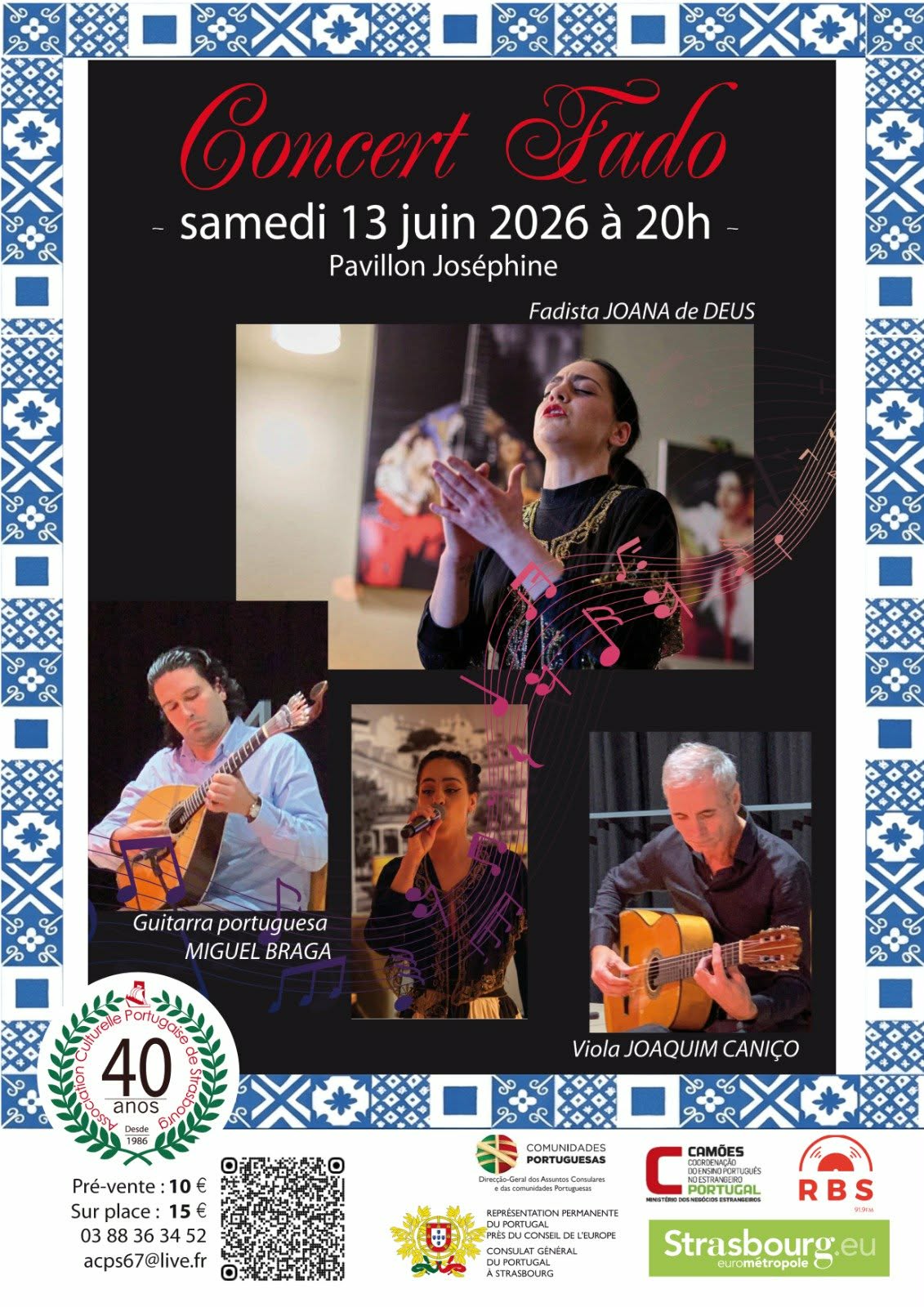 Venez passer un bon moment avec nous, en écoutant la belle voix de la fadista Joana de Deus accompagnée de Miguel Braga à la guitare portugaise et Joaquim Caniço na viola.