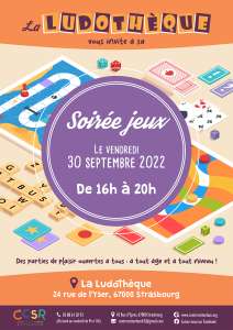 Rendez-vous à la première soirée jeux de la Ludo’ : animation, convivialité et plaisir seront au rendez-vous autour de jeux de société pour finir la semaine dans une ambiance ludique ! En famille, entre jeunes, à tout âge, seul ou à plusieurs, cet instant inédit est ouvert à tous et à tous les niveaux, débutant ou confirmé, guidé par l’expérience des ludothécaires qui seront présents sur place.  Ce moment de rencontre et de partage entre adhérents, habitants et habitués du quartier du Conseil des XV se déroulera le vendredi 30 septembre 2022 de 16h à 20h, à la Ludothèque au 24 rue de l’Yser à Strasbourg.