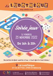 Rendez-vous à la troisième soirée jeux de la Ludo’ : animation, convivialité et plaisir seront au rendez-vous autour de jeux de société pour finir la semaine dans une ambiance ludique ! En famille, entre jeunes, à tout âge, seul ou à plusieurs, cet instant inédit est ouvert à tous et à tous les niveaux, débutant ou confirmé, guidé par l’expérience des ludothécaires qui seront présents sur place.  Ce moment de rencontre et de partage entre adhérents, habitants et habitués du quartier du Conseil des XV se déroulera le vendredi 25 novembre 2022 de 16h à 20h, à la Ludothèque au 24 rue de l’Yser à Strasbourg.