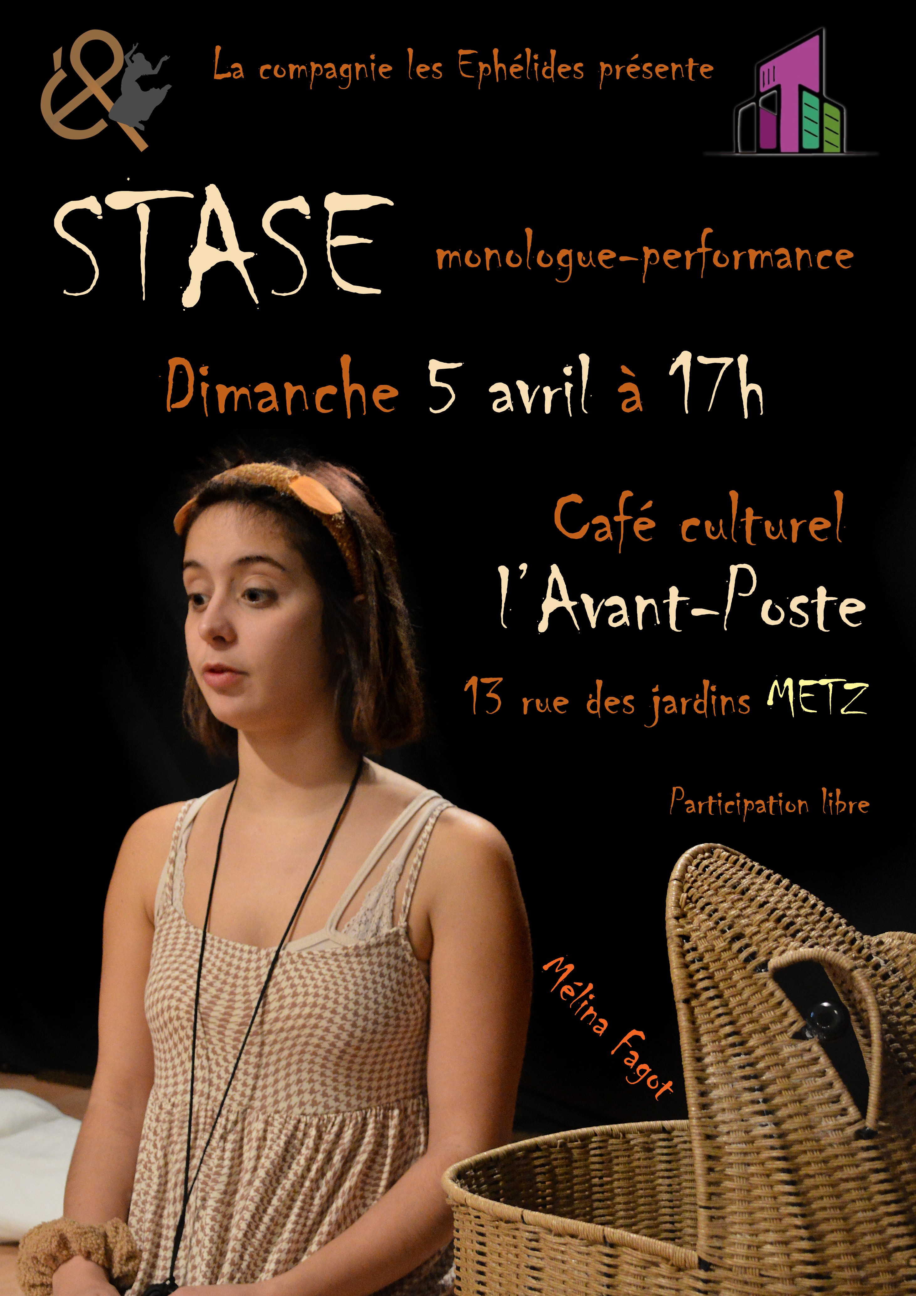 Monologue-performance de 30 mn sur le thème du temps par Mélina Fagot. Texte et mise en scène : François Camoes. "Stase" nous présente Ren, personnage décalé dont la vie dépend du chronomètre qu'elle porte au cou.