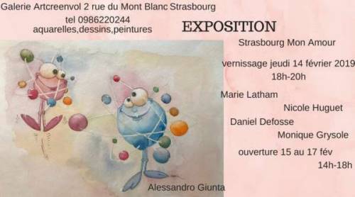 Vous y verrez les aquarelles, dessins et peintures des oeuvres de Giunta, Defosse, Latham,Grysole,Huguet sur le thème de Strasbourg Mon Amour