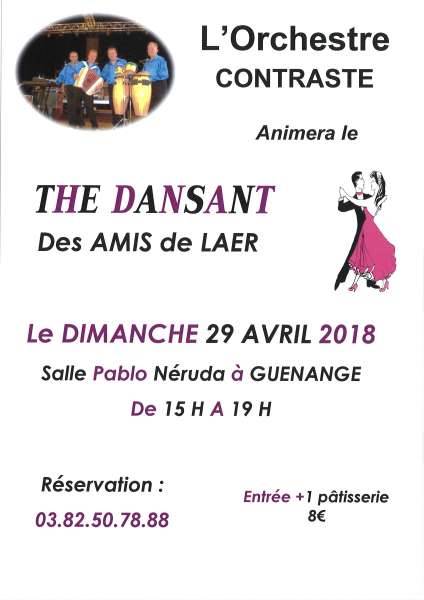 Le 29 Avril 2018 à la salle Pablo Neruda, l’Orchestre CONTRASTE animera le thé dansant des Amis de Laer, de 15h à 19 h. Le prix d’entrée est de 8€ et 1 pâtisserie. (Boissons, pâtisseries seront servis sur place.)