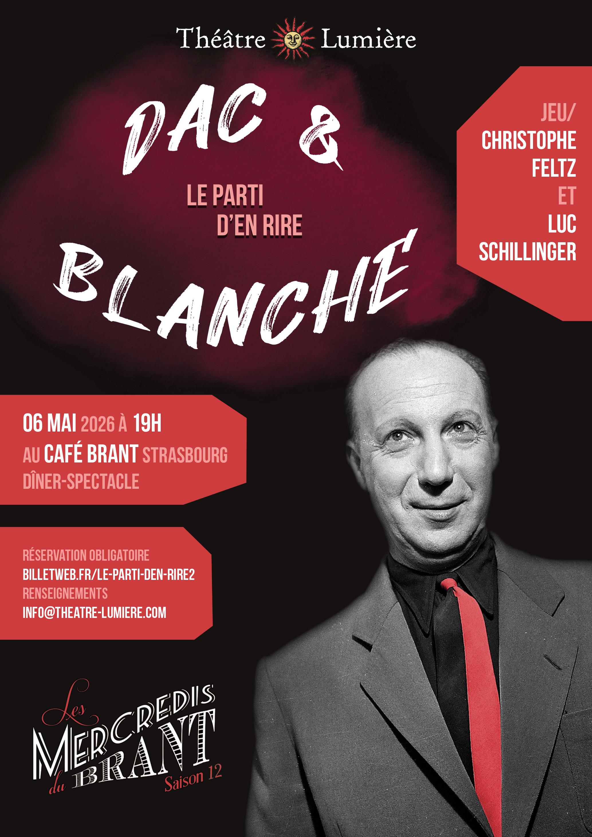 Dîner-spectacle de théâtre d’humour « Le Parti d’en Rire » de Pierre Dac & Francis Blanche avec les comédiens Christophe Feltz et Luc Schillinger le mercredi 06 mai 2026 à 19h au Café Brant à Strasbourg.