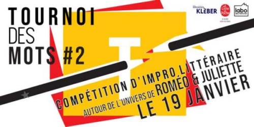 *Vous souhaitez assister au Tournoi des Mots en tant que spectateur et voter pour votre équipe favorite - Inutile de vous inscrire, rendez-vous simplement à la librairie Kléber à partir de 16h. Lors des phases d’écriture, pour vous divertir, un quizz autour de Roméo et Juliette et de Shakespeare vous sera proposé, des lots seront offerts aux plus rapides d’entre vous par le Livre de Poche. TOUT PUBLIC - GRATUIT