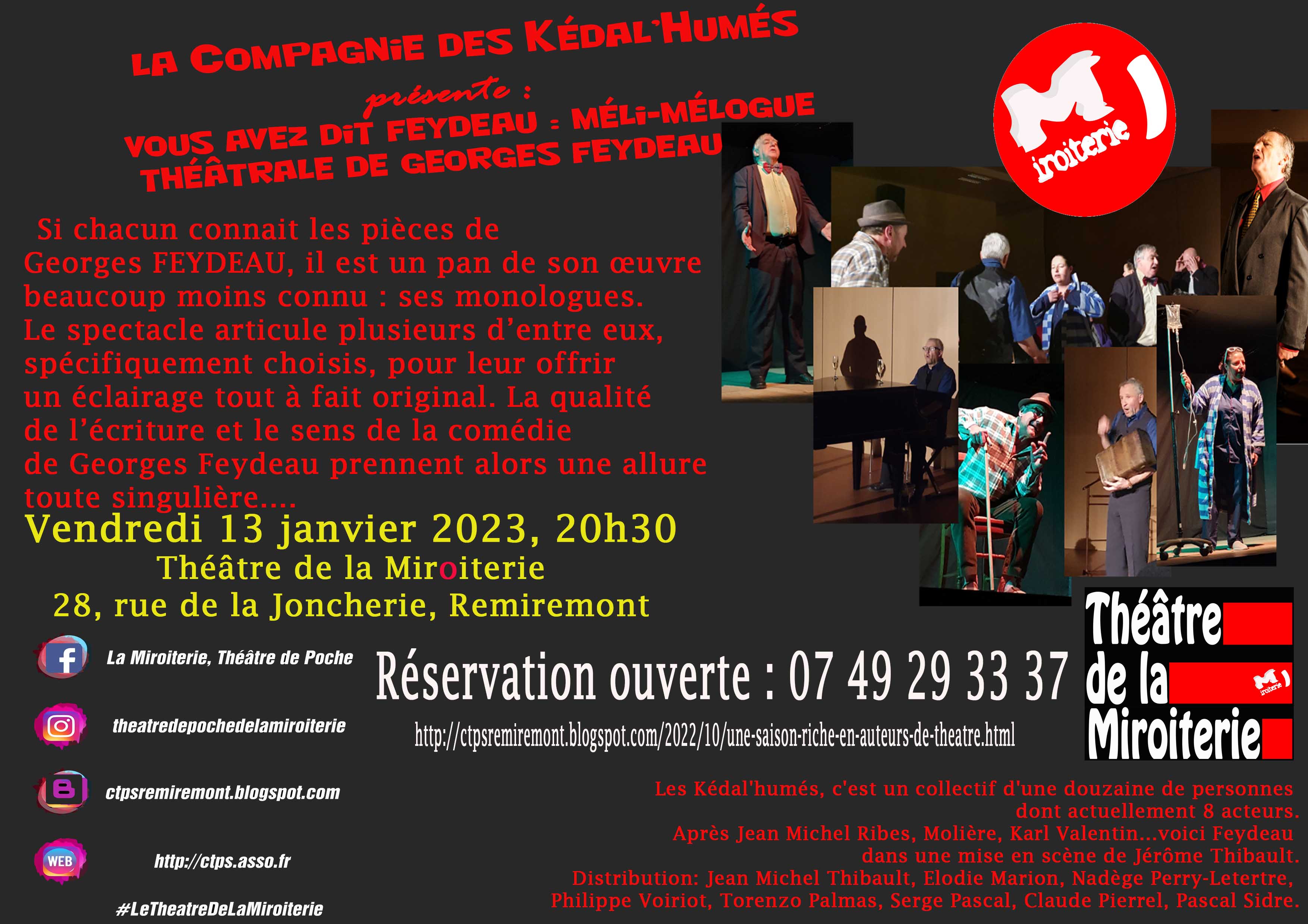 Pour bien démarrer l'année, le Théâtre de la Miroiterie a décidé de convier la truculence, l'esprit et la drôlerie. C'est Feydeau qui prendra la scène du Théâtre de Poche de la Joncherie le Vendredi 13 janvier 2023 à 20h30. Avec la Compagnie "Les Khédallumés" et le spectacle : "Vous avez dit Feydeau ? - La réservation est ouverte : 07 49 29 33 37