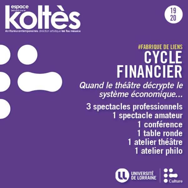 Ces ateliers s?inscrivent dans un cycle intitulé "cycle financier", qui comprend trois spectacles professionnels, un spectacle amateur, une conférence, une table ronde, un atelier théâtre et un atelier philo. Ce cycle tend à décrypter par le théâtre le système économique.