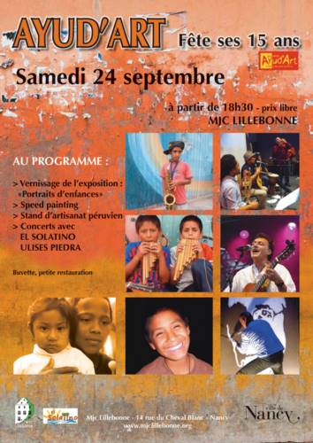 L’association AYUD’ART vient en aide aux enfants des rues du Pérou, Elle soutient le centre CIMA à LIMA qui a comme mission de changer le quotidien de ces enfants et de leur redonner un avenir, leur offrir un toit, les éduquer, les soigner, les nourrir. www.ayudart.org