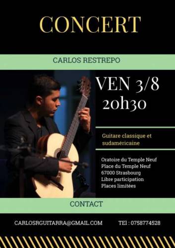 Carlos RESTREPO, guitariste classique d’origine colombienne, qui a fait ses études professionnelles à l’Université del Valle en Colombie, au Conservatoire de musique de Strasbourg et à l’Université de Strasbourg vous invite pour profiter d’un concert plein de différentes émotions et sensations d’un répertoire très varié avec des œuvres des compositeurs européens et sud-américains.