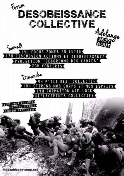 Dans le cadre du forum de désobéissance collective nous vous invitons à nous rejoindre le week end du 26/27 aout à Adelange