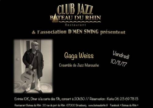 Originaire d’Alsace du Nord , Gaga Weiss est un guitariste de jazz manouche qui s’inscrit parfaitement dans la tradition initiée par Django Reinhardt. Entouré de trois excellents musiciens " Maxime Luck au saxophone, Christophe Reinhardt à la contrebasse et Lionel Galonnier à la batterie "