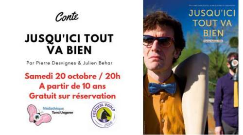 Dans “Jusqu’ici tout va bien” les univers du conteur Pierre Desvigne et du saxophoniste Julien Behar se rencontrent joyeusement. A travers quatre histoires burlesques et décalées, soutenues par des effets sonores et un saxophone complice, les deux artistes nous emmènent sur les territoires glissants de l’imaginaire.
