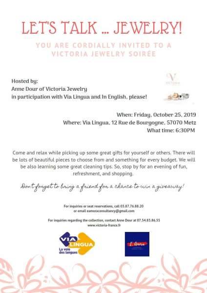 This event will be in Franglais. The presentation of the jewelry will be done in French, while the quick workshop on cleaning and maintaining the pieces will be done in English.
