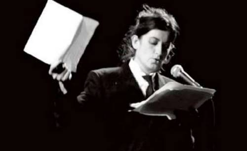 Assis devant un ordinateur et des consoles, un D.J. Debout devant un pupitre, une actrice. Elle est équipée d’une oreillette. Le DJ mixe des sons qu’on entend, et envoie dans l’oreillette de l’actrice des extraits d’enregistrements de discours de trois ministres de la Culture.