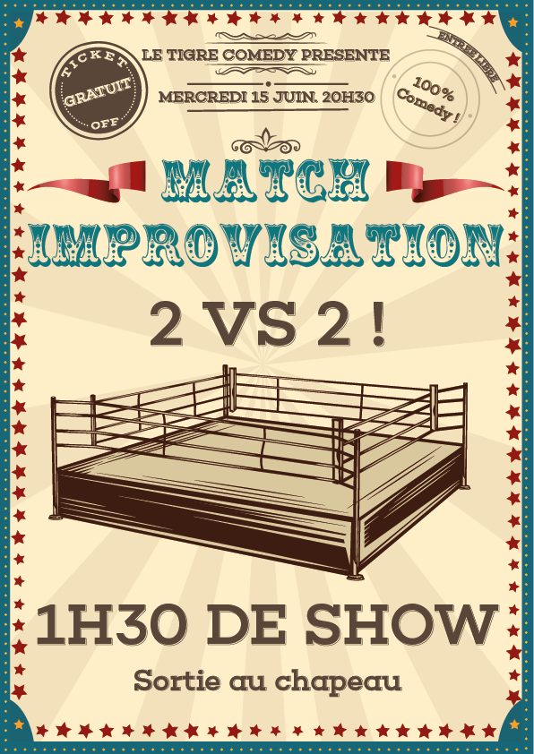 Le Tigre Comedy vous propose de venir découvrir sa soirée match d'impro en 2 vs 2 Mercredi 15 Juin à 20h30 !