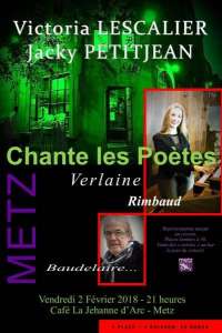 Venez découvrir Victoria LESCALIER au clavier et écouter Jacky PETITJEAN vendredi 2 février 2018 à 21h au caveau du café La Jehanne d’Arc à Metz. Amoureux de la poésie, ils vous interpréteront du Baudelaire, Rimbaud, Verlaine et bien d’autres comme vous ne les avez jamais entendu. Le prix des places est à 10 € avec une boisson comprise. Elles seront en vente à partir de 20h au bar du café le même jour que le concert. Places limitées à 50, aussi nous vous invitons à prendre vos dispositions. Merci et à bientôt parmi nous.
