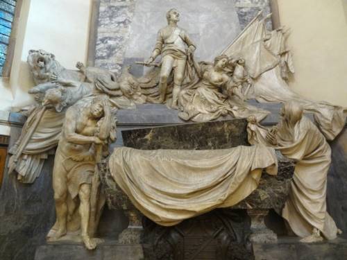 Joyau de l’église protestante Saint-Thomas à Strasbourg, le Tombeau du maréchal de Saxe a été élaboré par Jean-Baptiste Pigalle entre 1756 et 1777, année où il est effectivement installé dans l’église alsacienne. Le maréchal de Saxe, glorieux héros de guerre, aurait mérité une sépultur e dans l’un des lieux les plus prestigieux du royaume, mais ses origines bâtardes et étrangères ainsi que son appartenance au culte luthérien couplés peut-être, mais dans une moindre mesure, à une réputation de libertin, lui interdisaient Saint-Denis ou Notre-Dame. Le roi et son entourage pensent à Dresde et choisissent finalement Saint-Thomas à Strasbourg, sorte de cathédrale protestante.