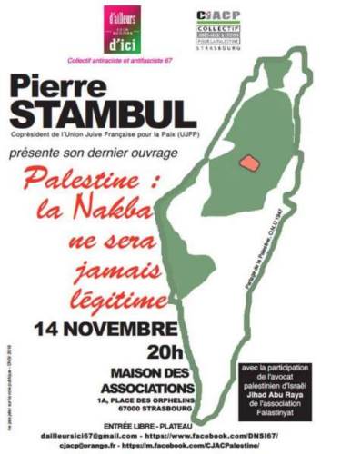 le Collectif D’ailleurs Nous Sommes d’Ici 67 et le collectif Judéo Arabe et Citoyen pour la Palestine vous invite à une réunion publique avec Pierre STAMBUL coprésident de UJFP qui présente son dernier ouvrage