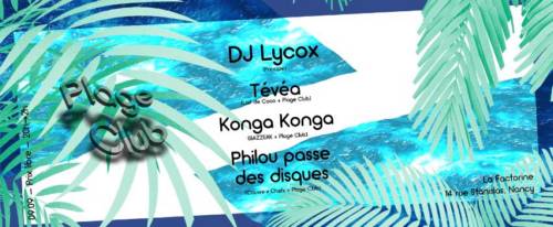 Pour cette deuxième soirée Plage Club, organisée à l’occasion du premier anniversaire de la galerie La Factorine, Konga Konga et Philou passe des disques invitent DJ Lycox, jeune producteur surdoué du label portugais Principe Discos qui distillera ses morceaux teintés de kuduro angolais. Le homie Tévéa sera également derrière les platines pour partager ses imparrables productions et sélections taillées pour le club.