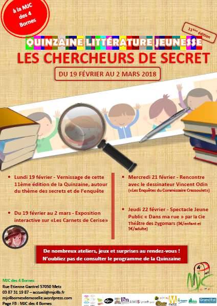 Du 19 février au 2 mars, la MJC des 4 Bornes à Metz propose un festival de littérature jeunesse autour du thème des secrets et de l’enquête.