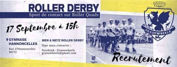 Les Graouwheels vont entamer leur 4eme année d’existence dans la pratique du Roller Derby. C’est un sport de contact sur roller quads fondé sur la stratégie d’attaque et de défense, dans une zone de jeu ayant la forme d’un anneau d’environ 3m de large (le Track). Le jeu se joue sous forme de Jam durant au maximum 2 min. Dans chaque Jam, 5 joueurs des 2 équipes (4 bloquers/défenseurs, et un jammer/attaquant) s’affrontent. Le jammer de chaque équipe, tout en tournant autour du track, doit marquer un maximum de points par Jam en passant les bloquers adverses (1 point par bloquer), donc 4 pts par tour/passage dans la défense adverse. Les nombreuses subtilités du jeu seront expliquées aux nouveaux arrivants.
